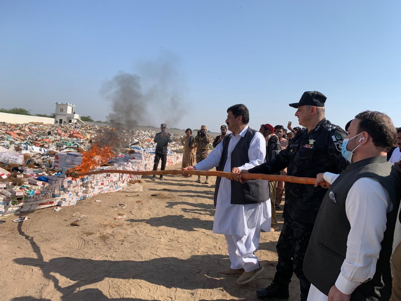 The incineration ceremony was attended by officers and staff of Customs Enforcement Gadani, along with the Deputy Commissioner and DPO Hub, Judicial Magistrate, representatives of the Environment Department, Pakistan Tobacco Company, Philip Morris, and officials from law enforcement and intelligence agencies.