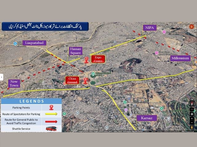 - Residents of District South, East, and Malir should use China Ground parking, accessible through Karsaz, New Town, or Rashid Minhas Road. Shuttle services from China Ground will also be available to and from the event venue.